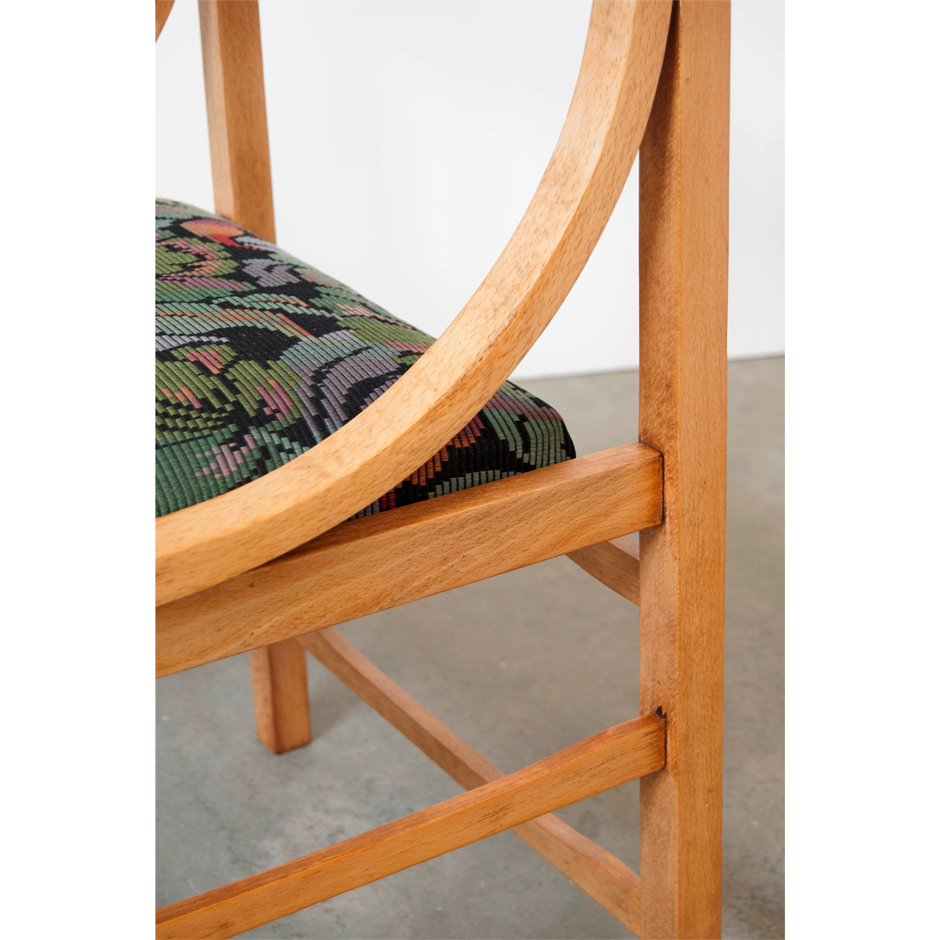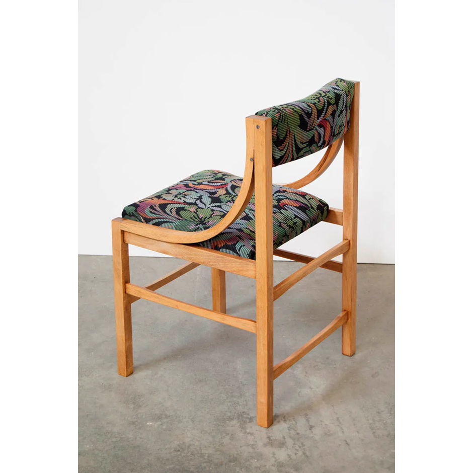 Silla Tangente. La combinación entre su estructura geométrica, marcada por esos arcos laterales, y el efecto como de impresión a 8 bits de las flores del tapizado nos fascina.